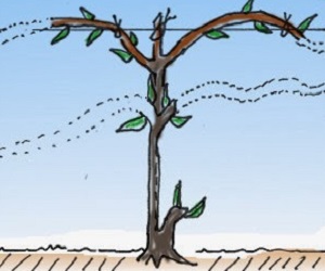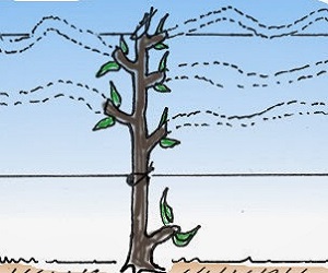 In a Single Guyot system, one cane from the previous year’s growth is kept and tied horizontally along the trellis wire, while the other shoots are removed:
